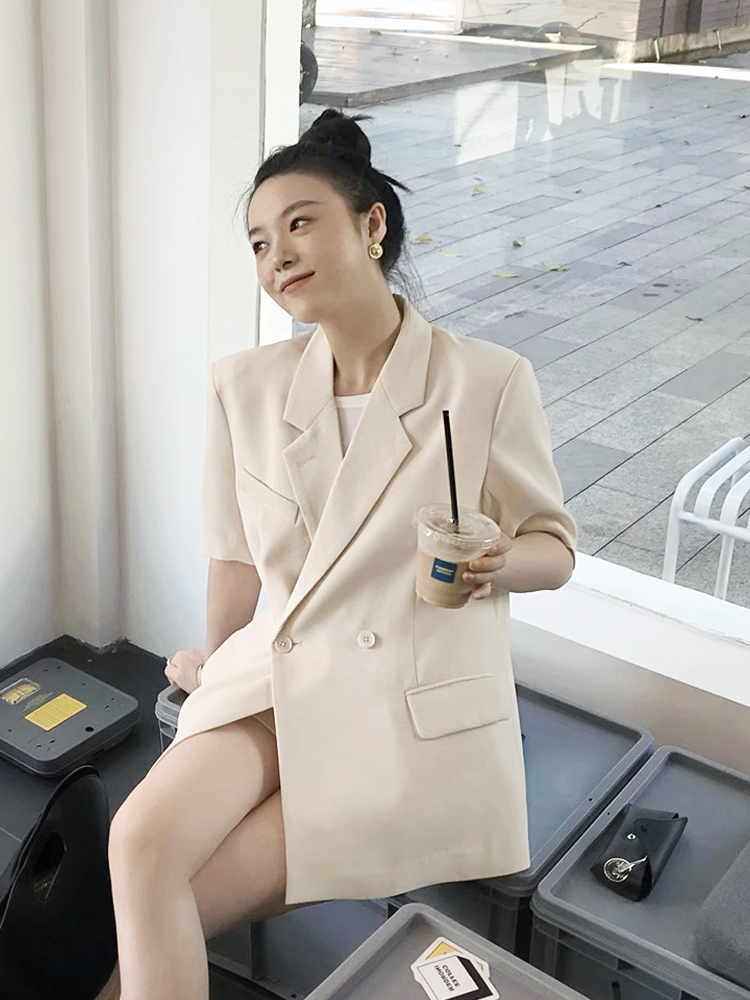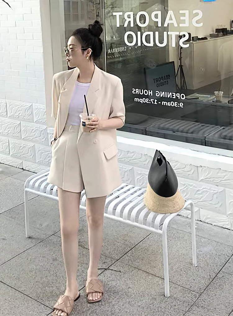 ✧長版的西裝外套+西裝短褲設計修飾梨形身材